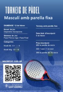 Ja estan obertes les inscripcions del proper Torneig de Pàdel del diumenge 12 de febrer. Aquest torneig està pensat per parelles masculines i hi ha urà 2 nivells de joc (avançat i intermig) Les inscripcions les podeu realitzar a través del codi QR del pòster. I teniu de termini fins el proper dimarts 7 de …